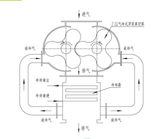 ZJQ氣冷羅茨真空泵工作原理: 氣冷羅茨真空泵通過兩個三葉型轉子,在一對同步齒輪的驅動下交替吸入和排出氣體。氣冷羅茨泵在工作中,被抽氣體是從垂直上方吸入,垂直下方排出。泵的兩端均有冷卻返氣口,向泵內不斷提供冷卻空氣或用冷卻器進行冷卻。 ZJQ氣冷羅茨真空泵工作原理圖: ZJQ氣冷羅茨真空泵技術參數