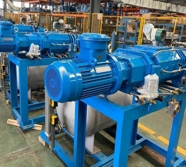 安徽某企業的生產范圍主要是一些化工產品以及助劑的研發制造,生產工藝中涉及到有機溶劑的應用與回收。在原有的生產工藝中,有機溶劑的回收是通過水環真空泵系統來實現的,原系統運行過程中,有機溶劑會與工作介質水混合,增加了后期有機溶劑的回收以及對污水的處理成本。同時工作溫度的變化對水環真空泵的真空度會產生直接的影響,導致了其工藝中的真空度達不到要求,效率低下。 為此,企業技改中采用干式真空泵來替代水環泵后,不僅提高了溶媒回收率,而且減少了大量污水處理費用,完全達到了環保要求。